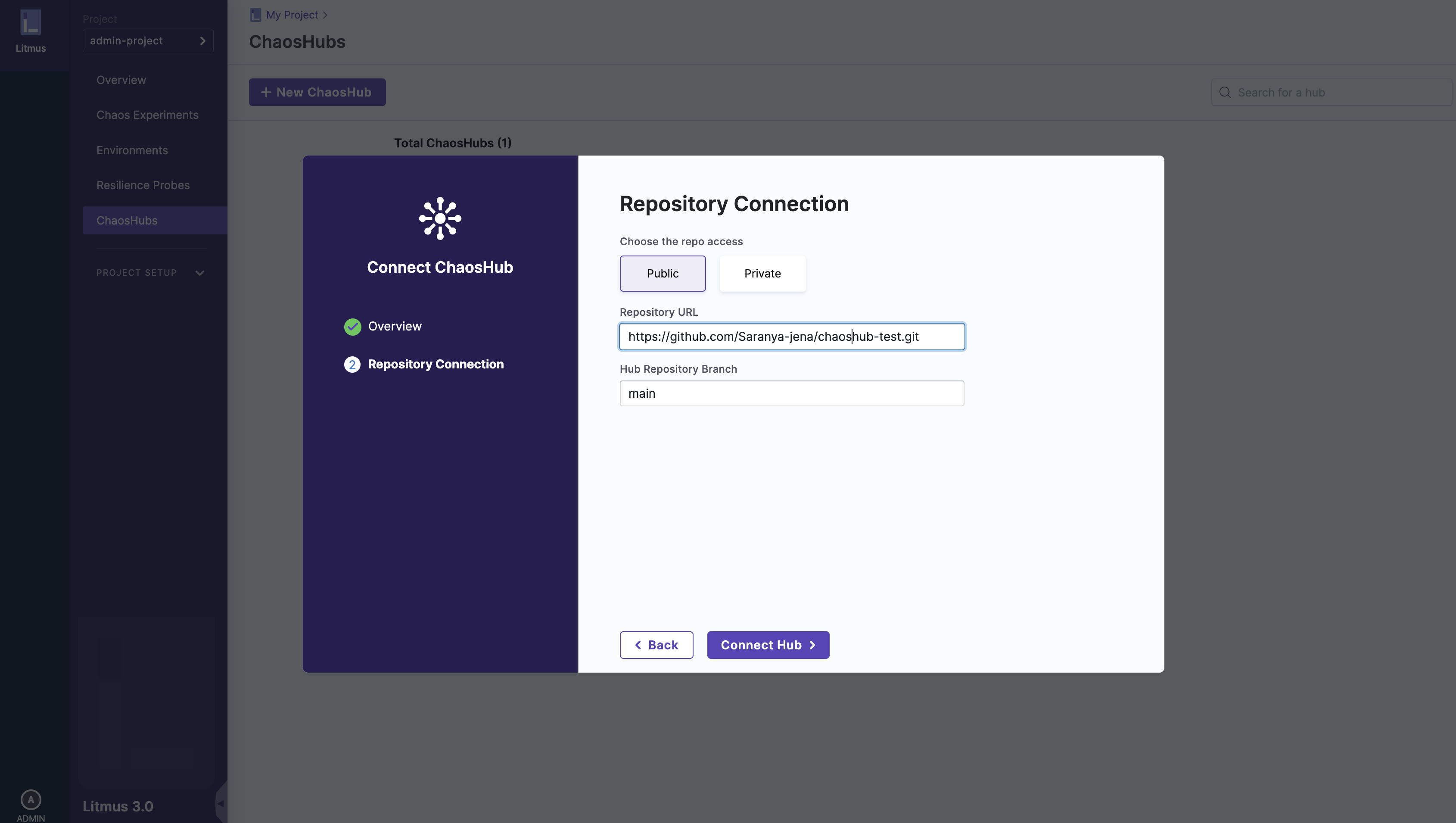 By default, a public ChaosHub is provided when the ChaosCenter is installed for the first time.