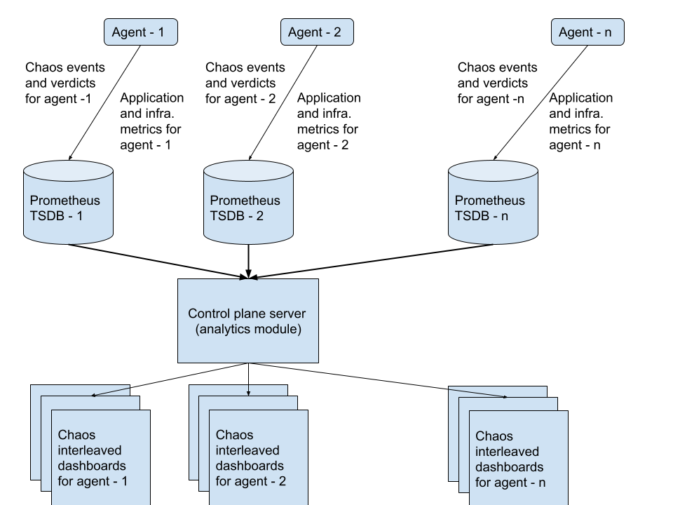 • Separate dashboards can be created by selecting specific chaos delegate s and the data source which is essentially a Prometheus time series database, collecting metrics from the chaos delegate cluster for application / infra metrics, chaos events and chaos verdicts.